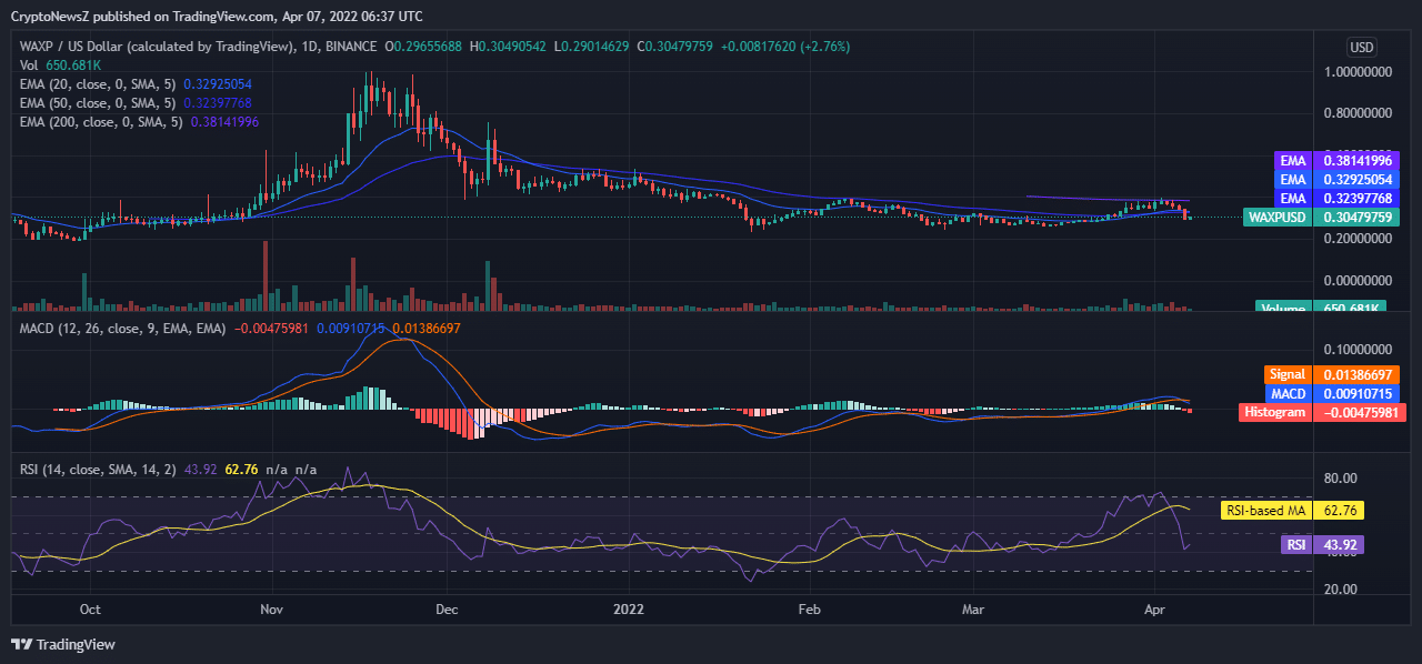 From technical analysis data, immediate resistance is placed at $0.329, if WAXP price can break this level, it has to face the hurdle of $0.397. The next resistance is $0.440. Major resistance is placed at $0.536 levels. If the WAX price drop continues, the WAXP price hits the support of $0.259, and investors can wait for the next support. Major support is placed at $0.230.