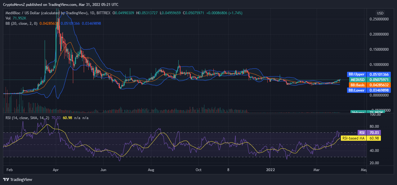 The price of MediBloc started to surge in the first quarter of 2021. The chart shows an increase in volume compared to the average trading volume for the prior period of 2021. In the month of February 2021, the MED price started to increase gradually at first, as the RSI created an overbought signal, and the MediBloc price increased ten folds in a matter of weeks.
