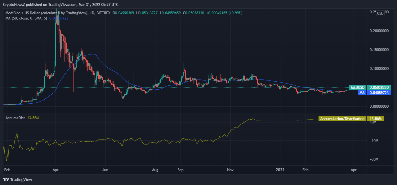 Since December 4 2021, there has been a sharp decline in the price of MediBloc. A slight recovery was observed in January 2022, but again there was a downfall in the price since then. Though, currently there can be seen a hope that the price might rise in the short term as minor increase is seen.