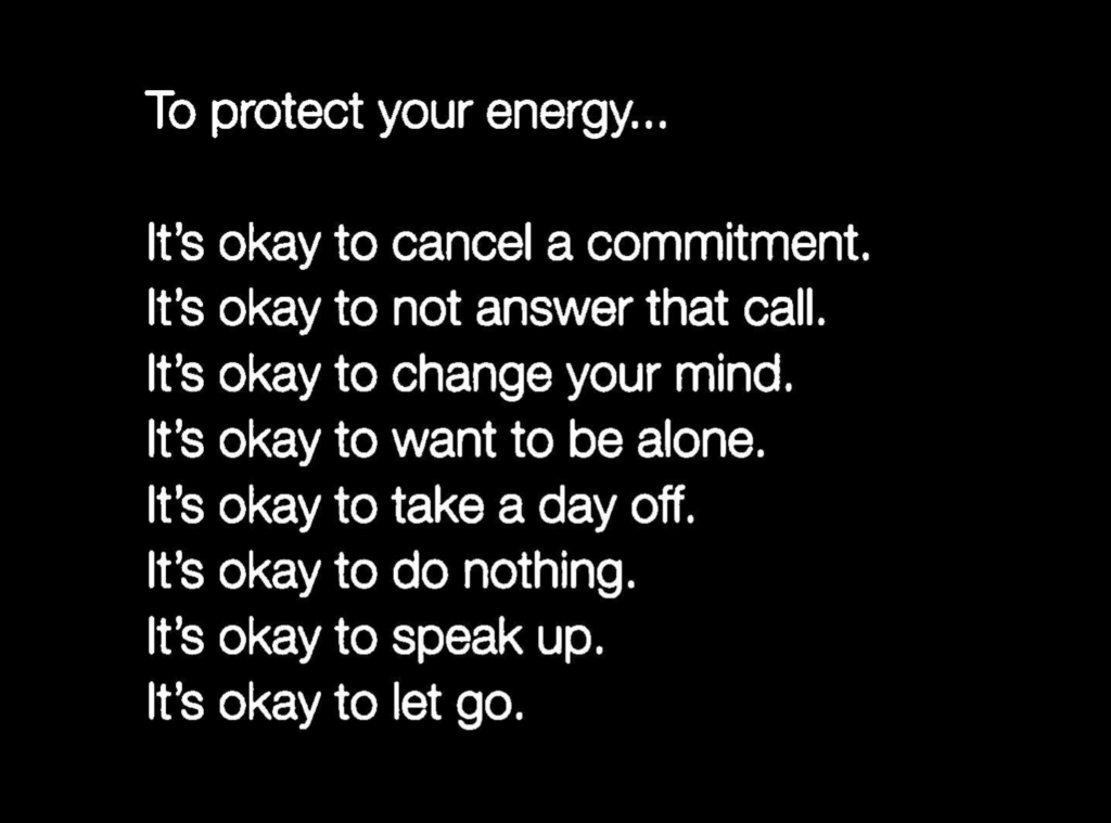 Today’s quote is a permission slip to protect your energy at all costs. Know it’s okay to cancel, not pick up, change your mind, be alone, take a day, do nothing, speak up, or let go. Because Everything Is Energy. What we allow or decline is a broadcast.
