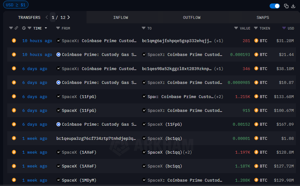 According to Arkham Intelligence and on-chain sleuth Lookonchain, the transfer was part of a larger set of transactions that saw more than 1,207 BTC leave a wallet linked to SpaceX.